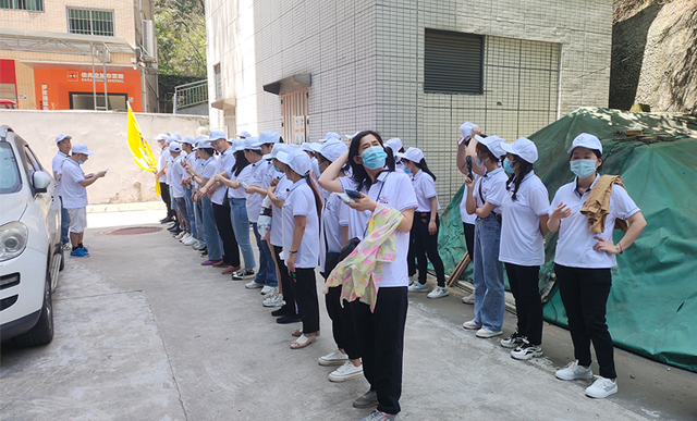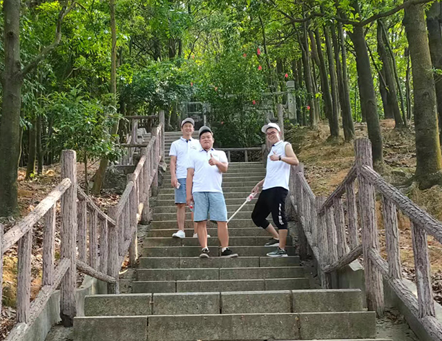 山路前半段稍緩和,大家還能大隊結伴而行,甚至走在隊伍最前方的帶隊同事還能高舉旗幟快速奔跑,但在行進至快半山腰后,坡度陡峭的石階路開始出現,上山路途難度加大,隊伍逐漸形成了梯隊。體力好、耐力強的同事依然穩步快速向上,體力稍遜的同事雖然與前面的同志拉開了距離,但也絲毫不甘落后,勇往直前,奮起直追。盡管山路漸陡、腳步變得沉重,呼吸變得急促,但是,大家互相關照,相互勉勵,共同堅持,最終成功登頂。
