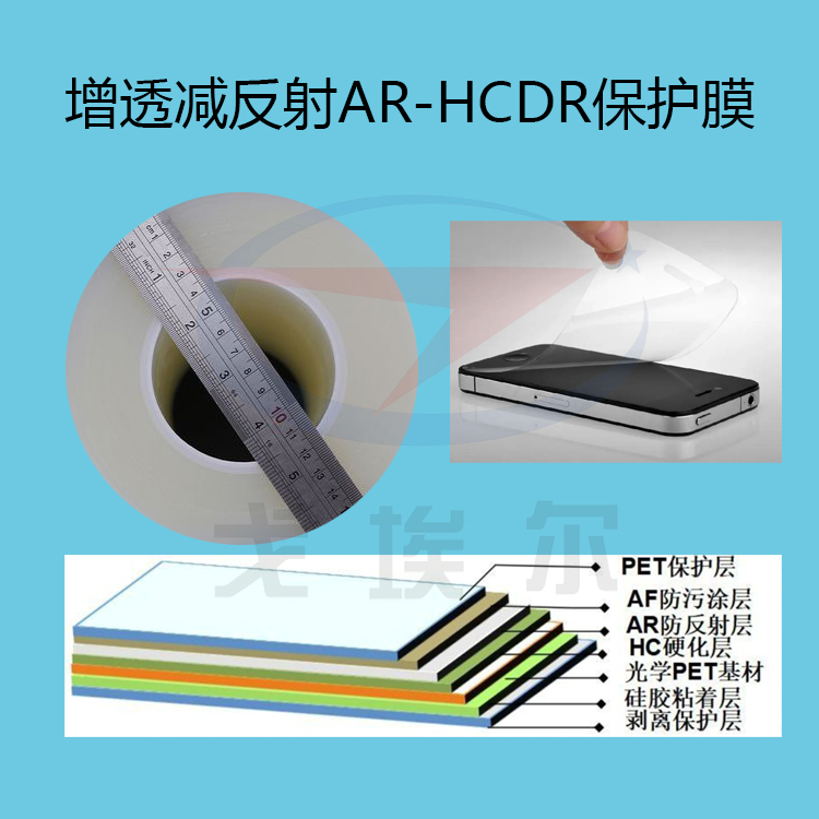 增減反射AR-HCDR保護(hù)膜的主要構(gòu)造者由PET保護(hù)層、AF抗污抗污涂層、AR反射層、HC硬化層、光學(xué)PET基材、硅膠粘合層和剝離保護(hù)層組成。增減反射AR-HCDR保護(hù)膜的原理是利用納米AR涂層抑制強(qiáng)光反射,增加透明度。通過不同光波段的干涉,透光率增加3%-4%,減少或消除了透鏡鏡片、棱鏡、平面鏡等光學(xué)表面上的光學(xué)表面,從而增加了這些部件的透光率,從而提高了屏幕顯示的清晰度。